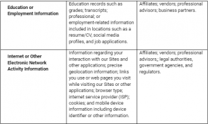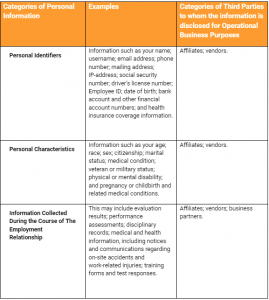 In the past 12 months, we have collected and/or disclosed the Personal Information discussed above in section 4. “Categories of Information We Collect.” The chart above also sets forth the categories of third parties to which we disclosed Personal Information for our operational business purposes within the preceding 12 months.